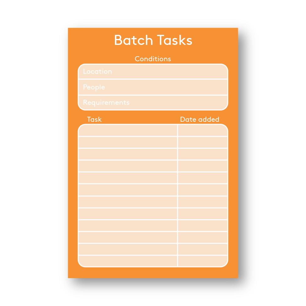 Batch encourages you to organise tasks with similar conditions onto the same list. Collect tasks over the course of a week and then breeze through them in one go. -