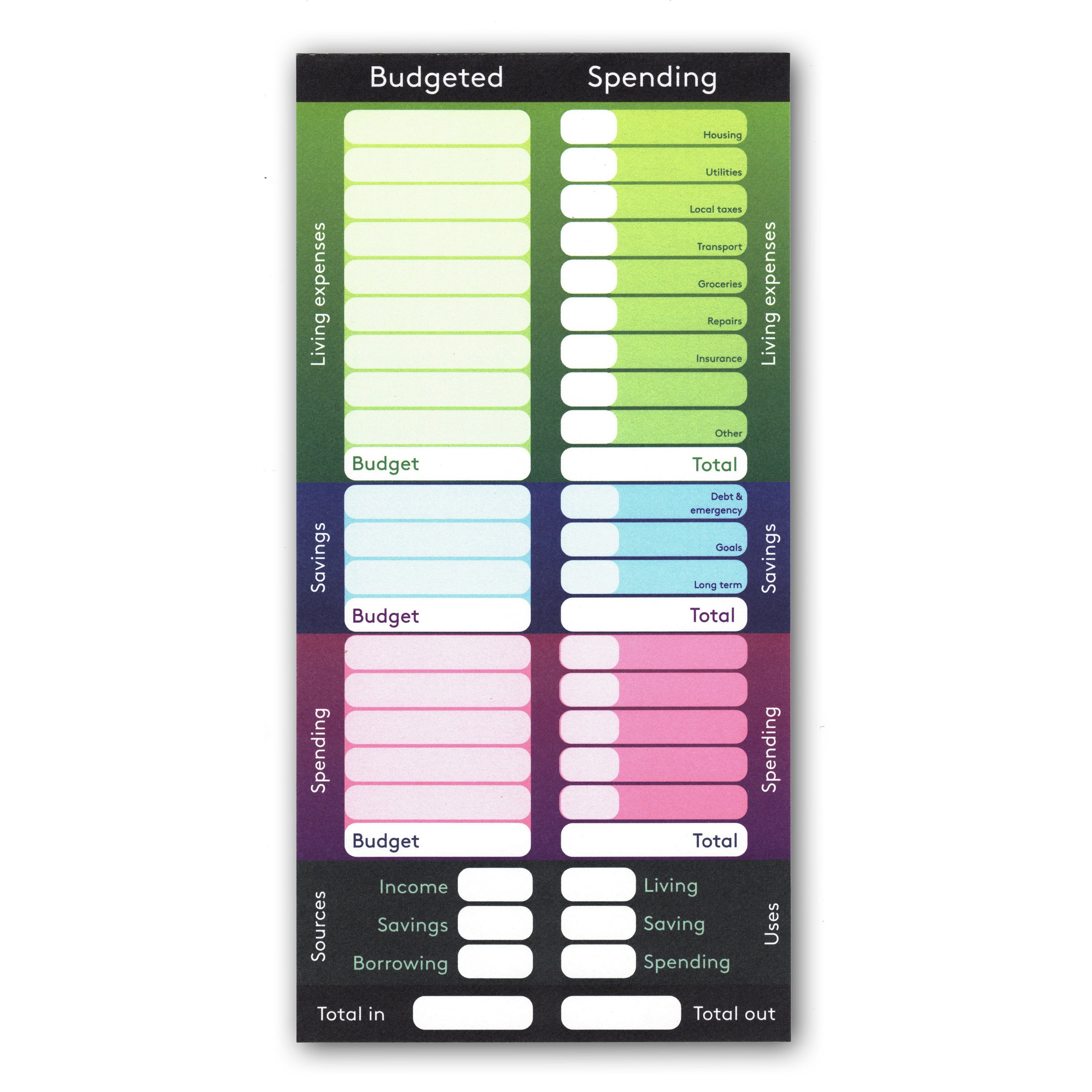 This notepad is based on the 50-20-30 rule. This states that 50% of your income should go towards everyday living expenses, 20% should go towards long term saving or paying off debt, and 30% should go towards non-essential spending. This notepad asks you to make a plan each month or week as to where you're spending is going to go, and then to write down what actually happened. It uses a balance sheet system to force you to account for every coin. If you spent more than you earned, did the extra cash come from savings or credit cards?
