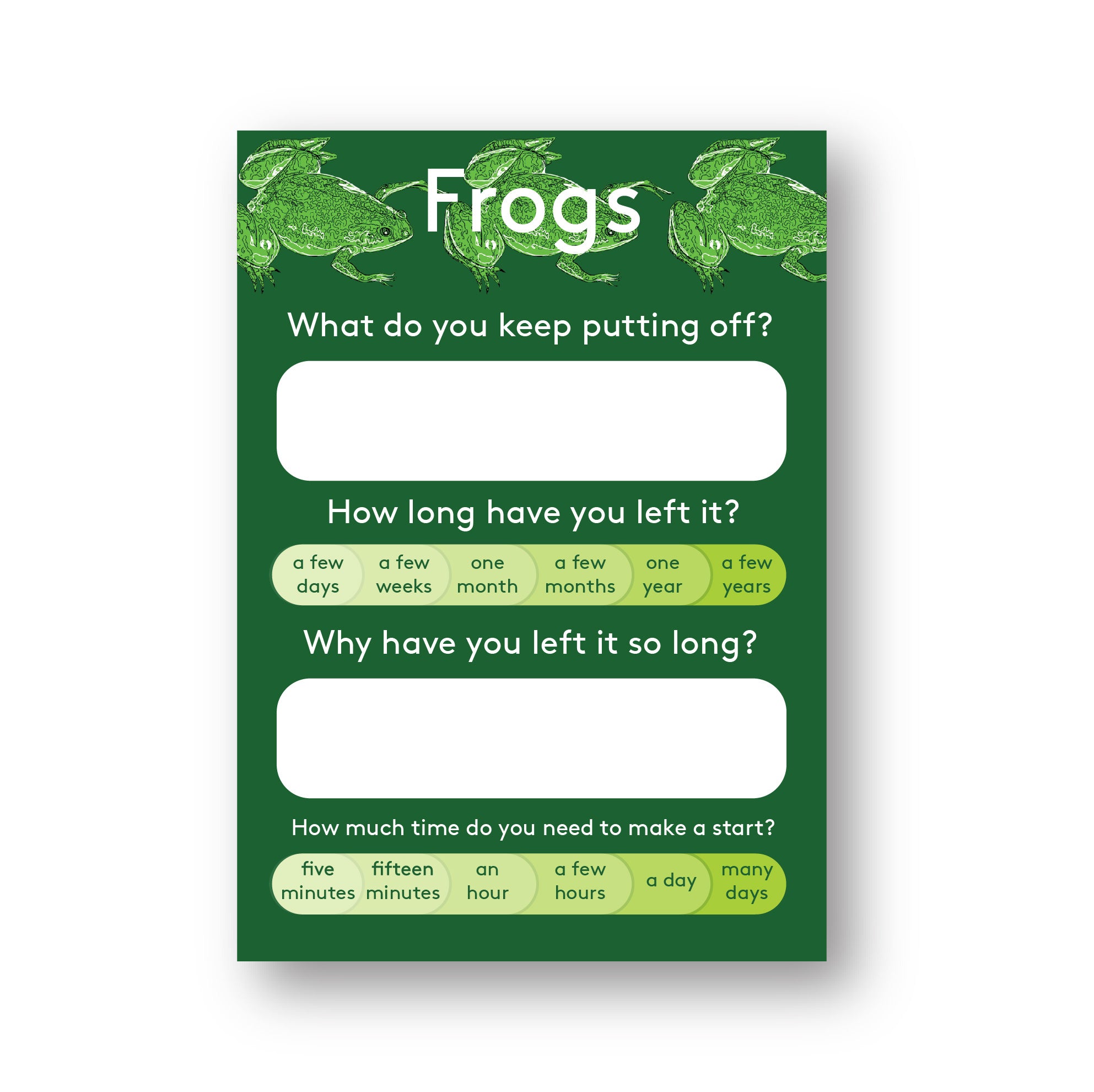 Frogs are tasks that you’ve been putting off for a long time which somehow never get around to.