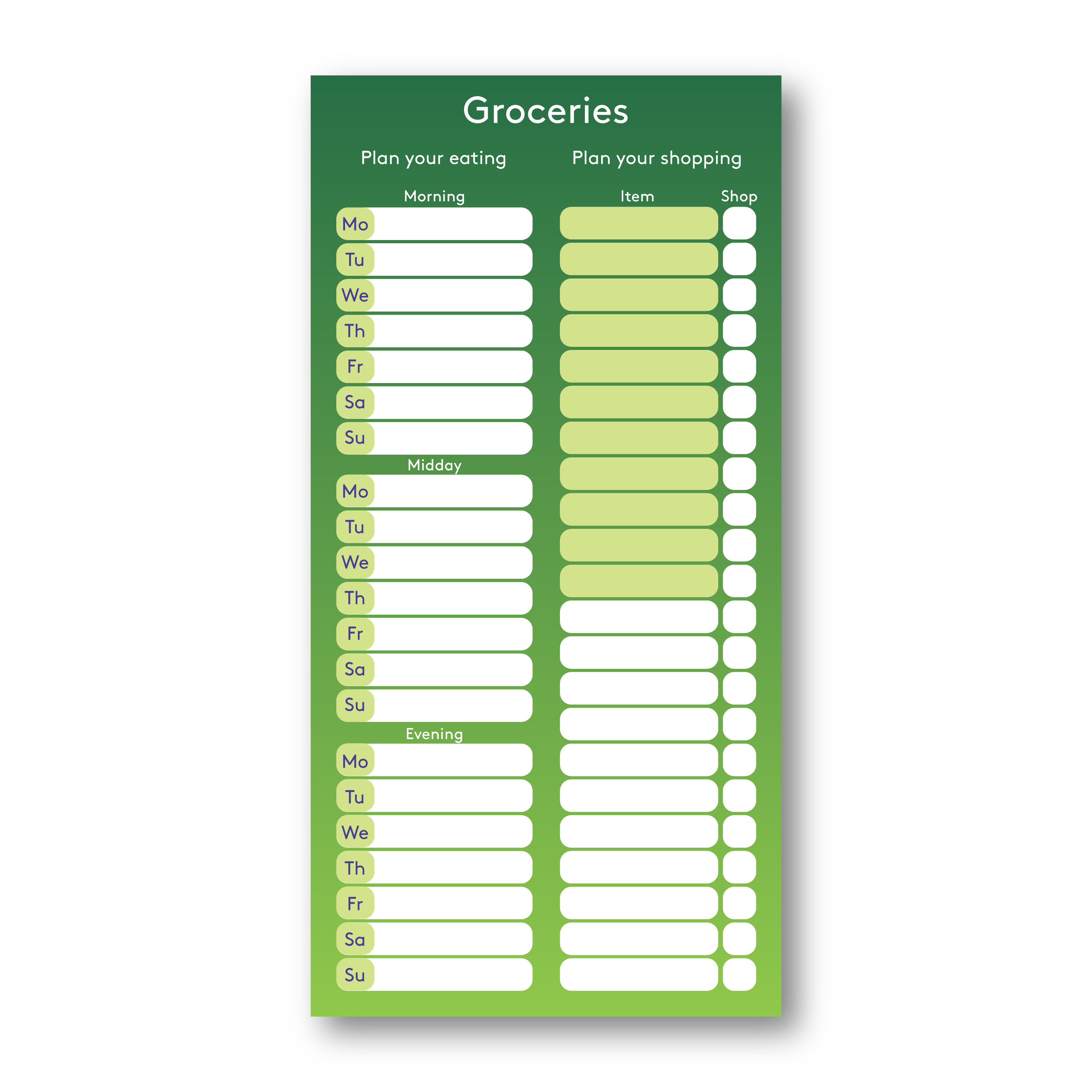 This grocery list is designed to help you decide what to buy based on what you plan on eating over the course of the week.