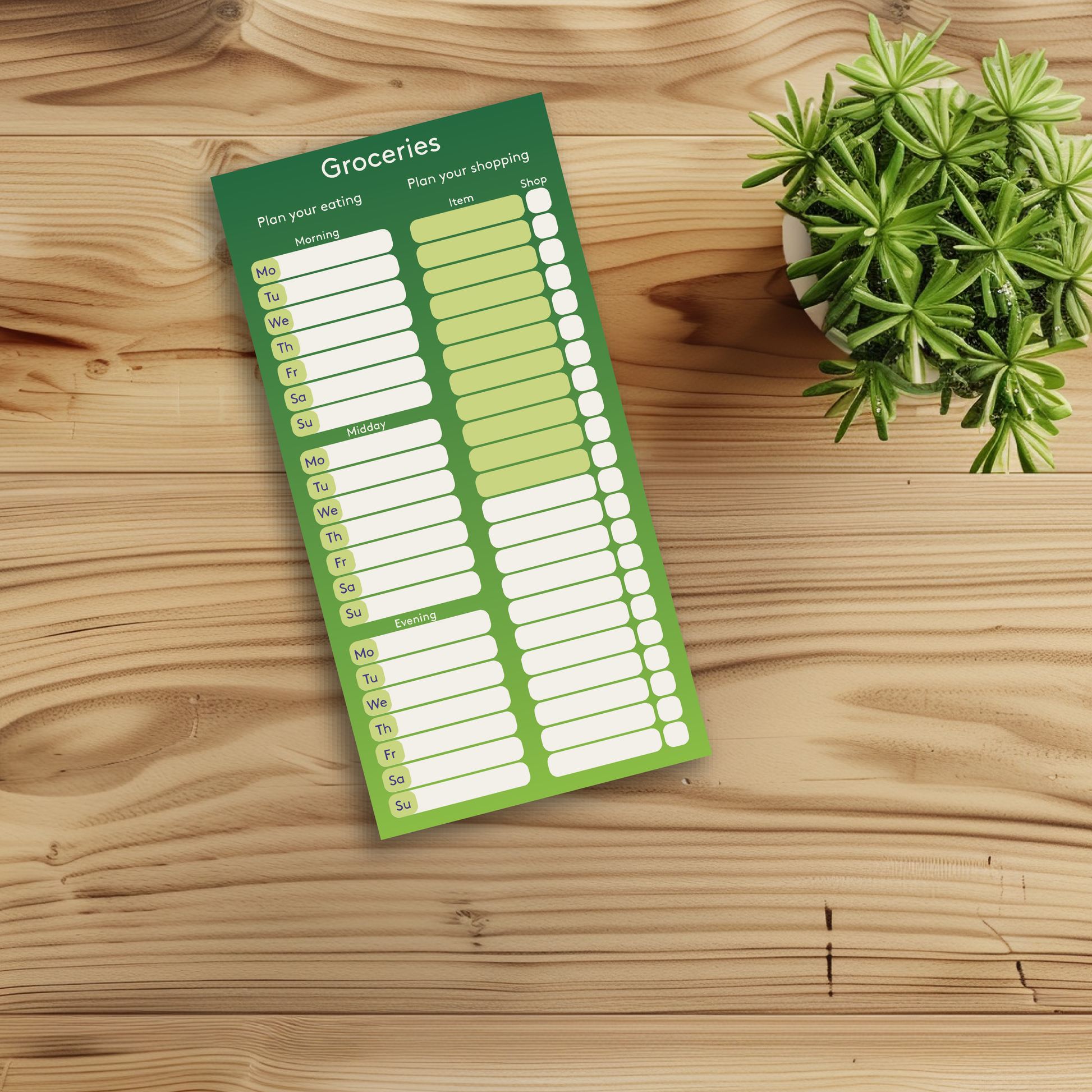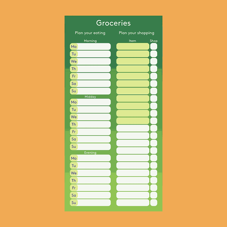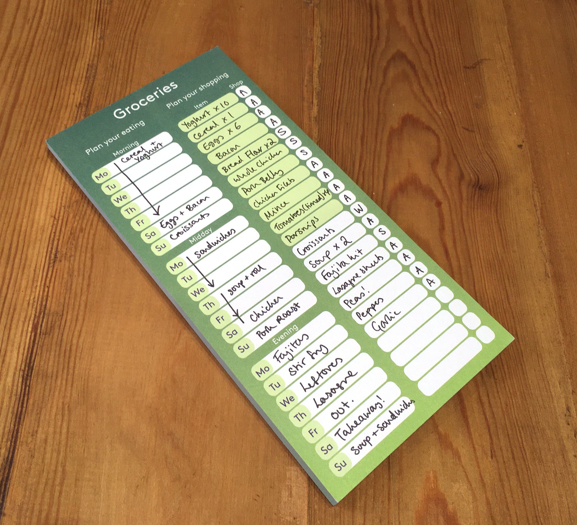 This grocery list is designed to help you decide what to buy based on what you plan on eating over the course of the week. There is no right way to fill in the list. I’ll often start by filling in all the existing food that needs to be eaten on the right hand side, working out how to turn this into meals on the left, and then add any remaining ingredients on the right. There is an additional column for entering the shop that you intend to buy the item from for people who shop in multiple locations (and then remember the one thing they forgot once they’ve left the first one).