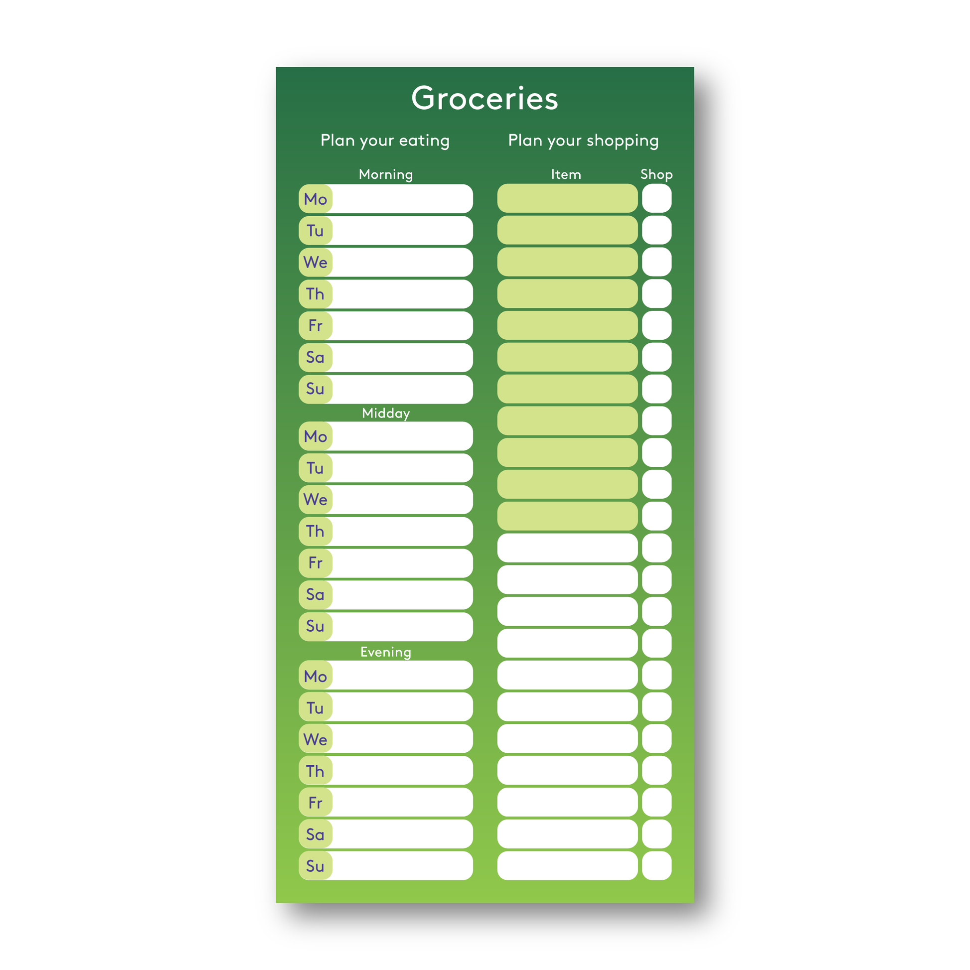 4. Write out what foods to you need to buy for the meal plan you've written. Fresh or unprocessed foods go in the green lines. Processed or packaged foods go in the white lines.
