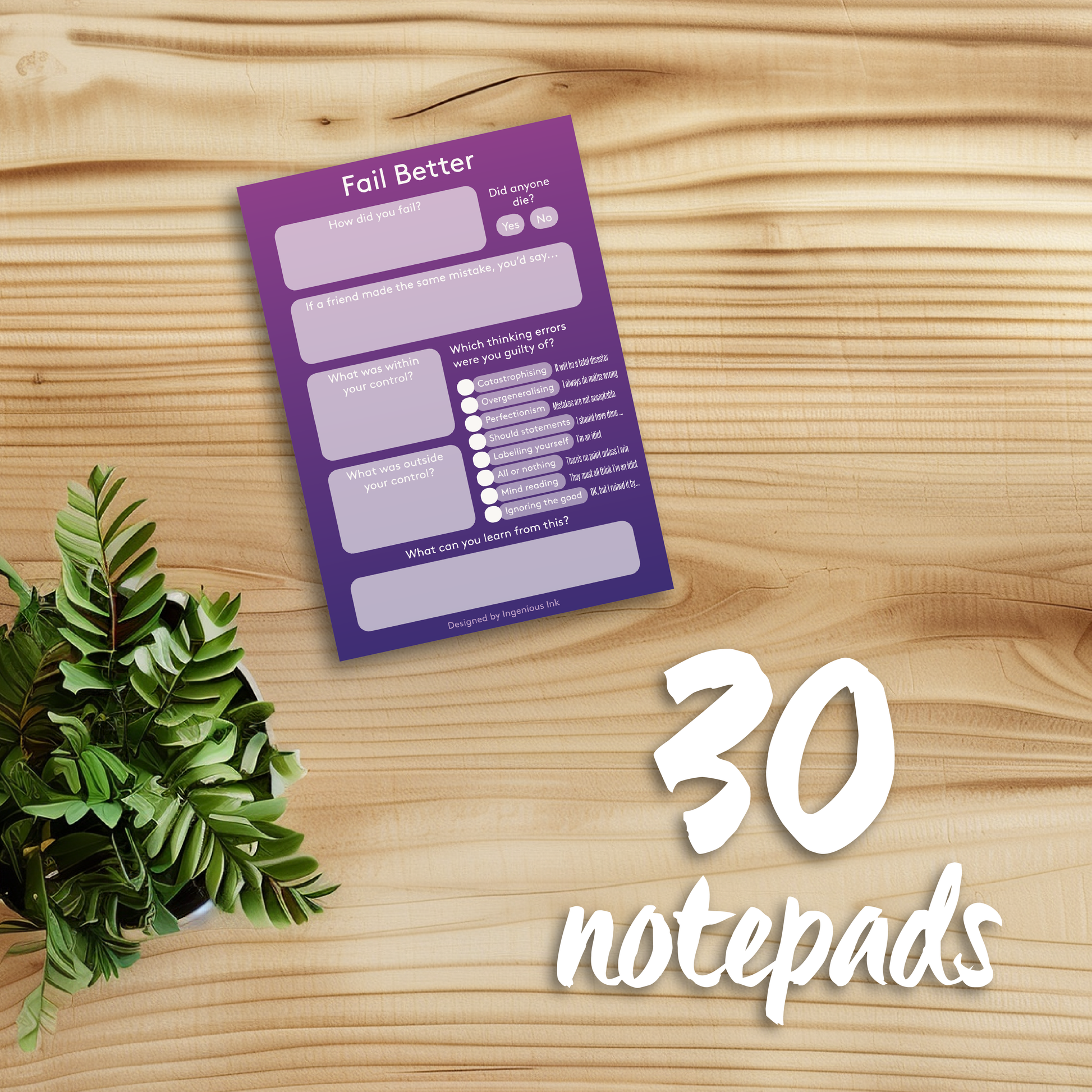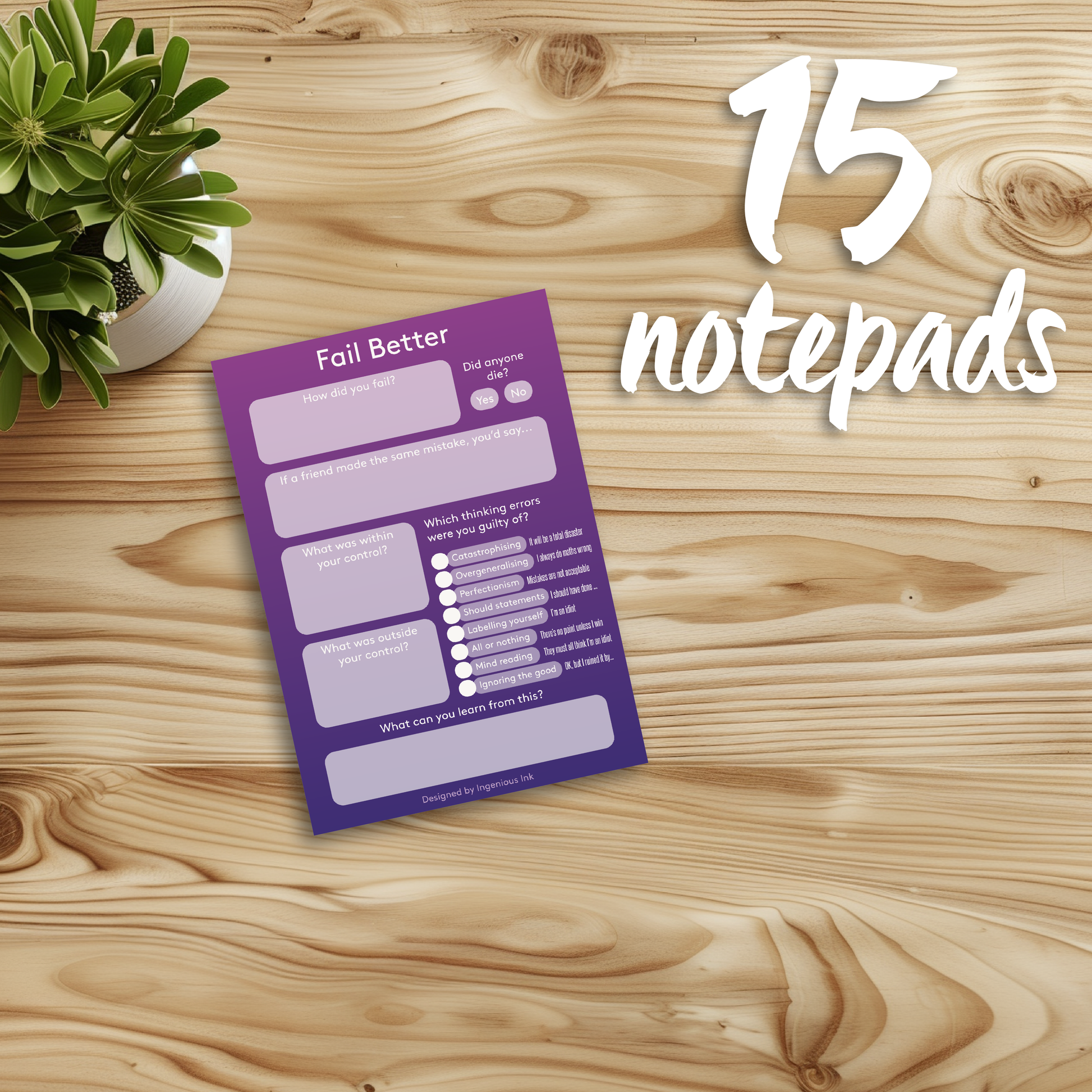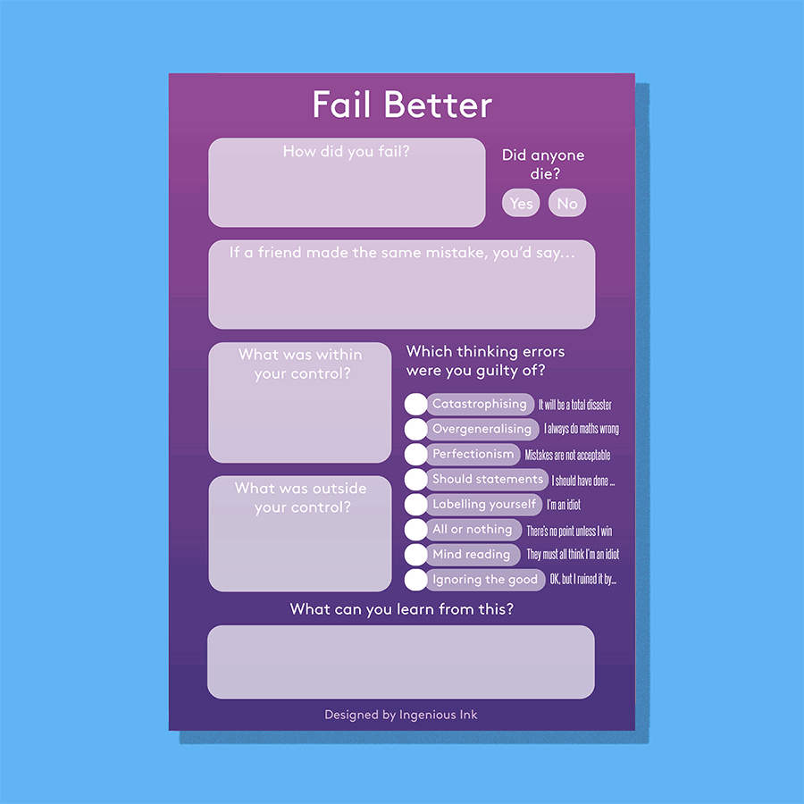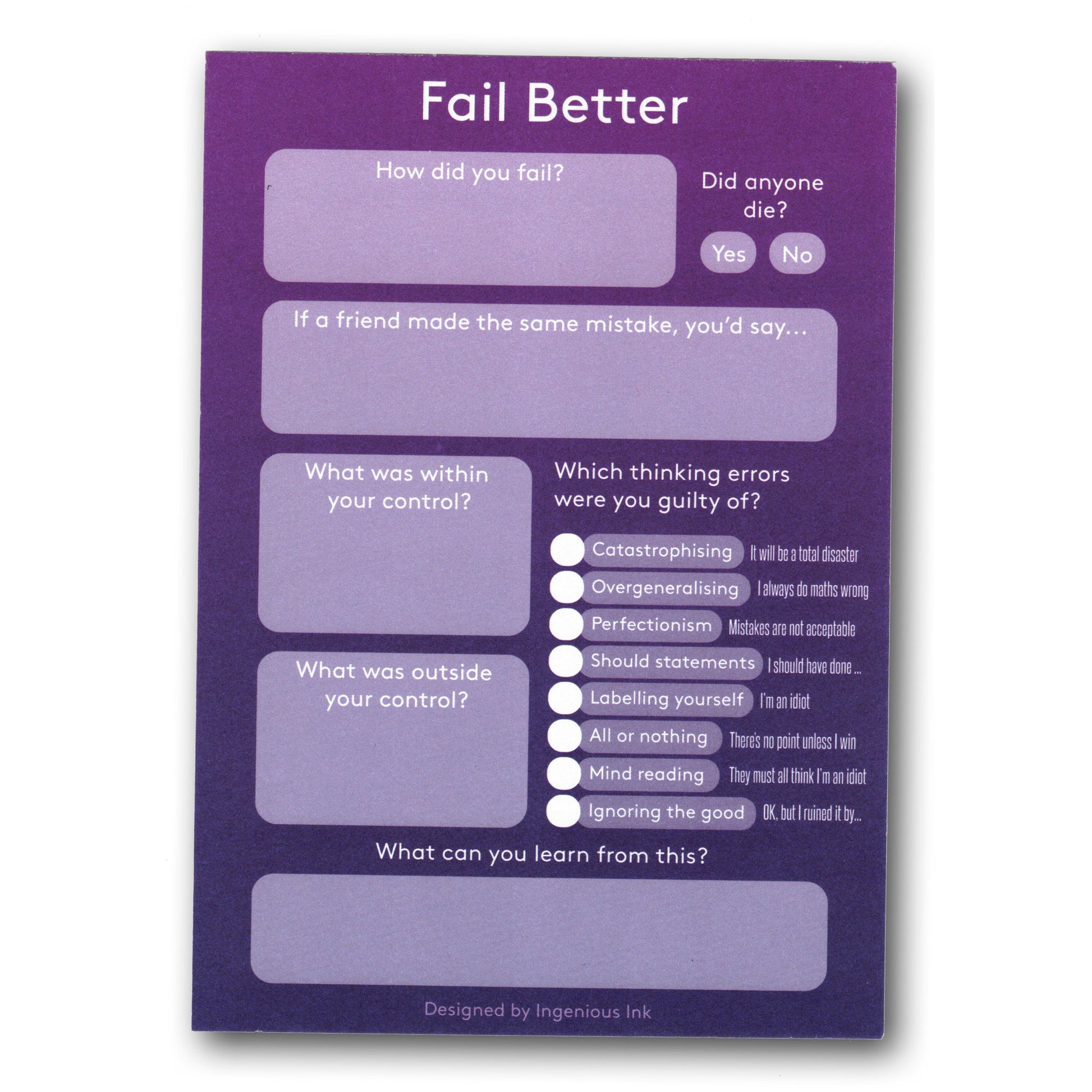 We designed this notepad to work through various issues sequentially. The first step was to get people to address that whatever their failure was, it probably wasn’t as bad as they were making it out to be. The second step is to identify the source of the emotional feelings that are stopping you from confronting the failure. Maybe you’re afraid that you’re just destined to fail this way forever, maybe you’re annoyed at yourself. Take a step back and try dispassionately reevaluating the situation. Finally focus on the things that you could control and work out how you could change these next time.