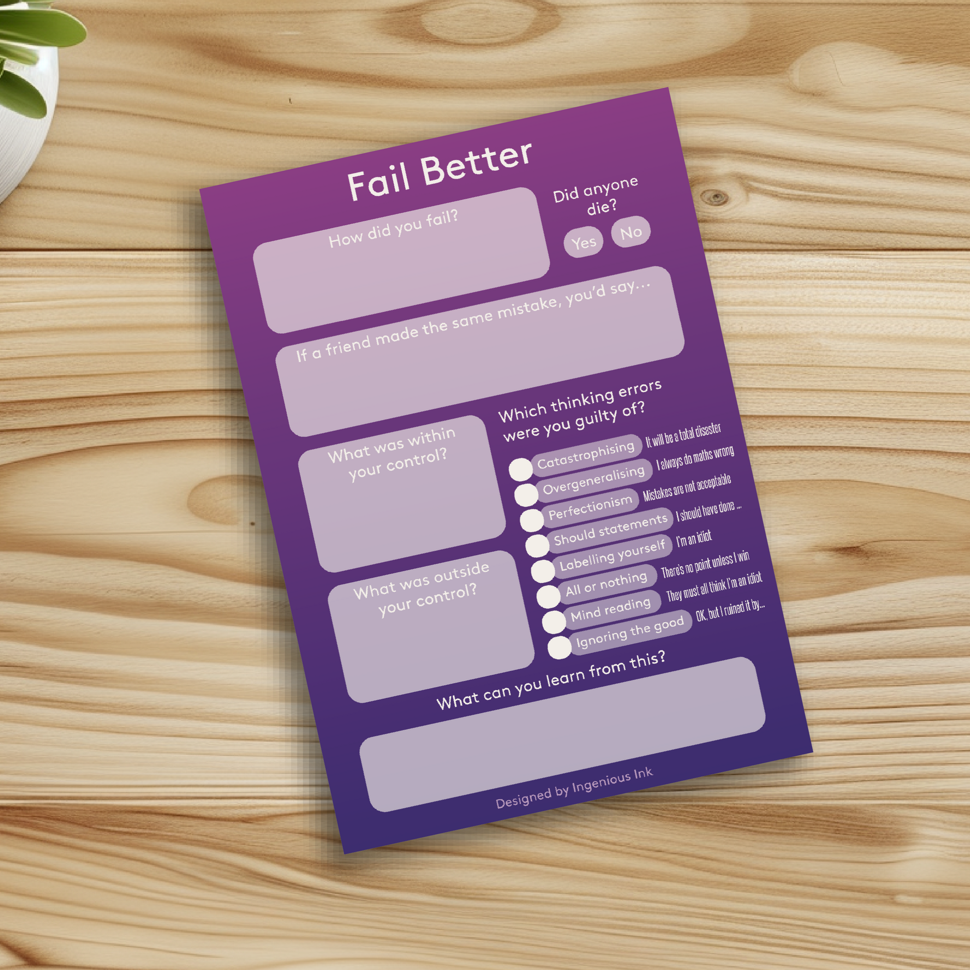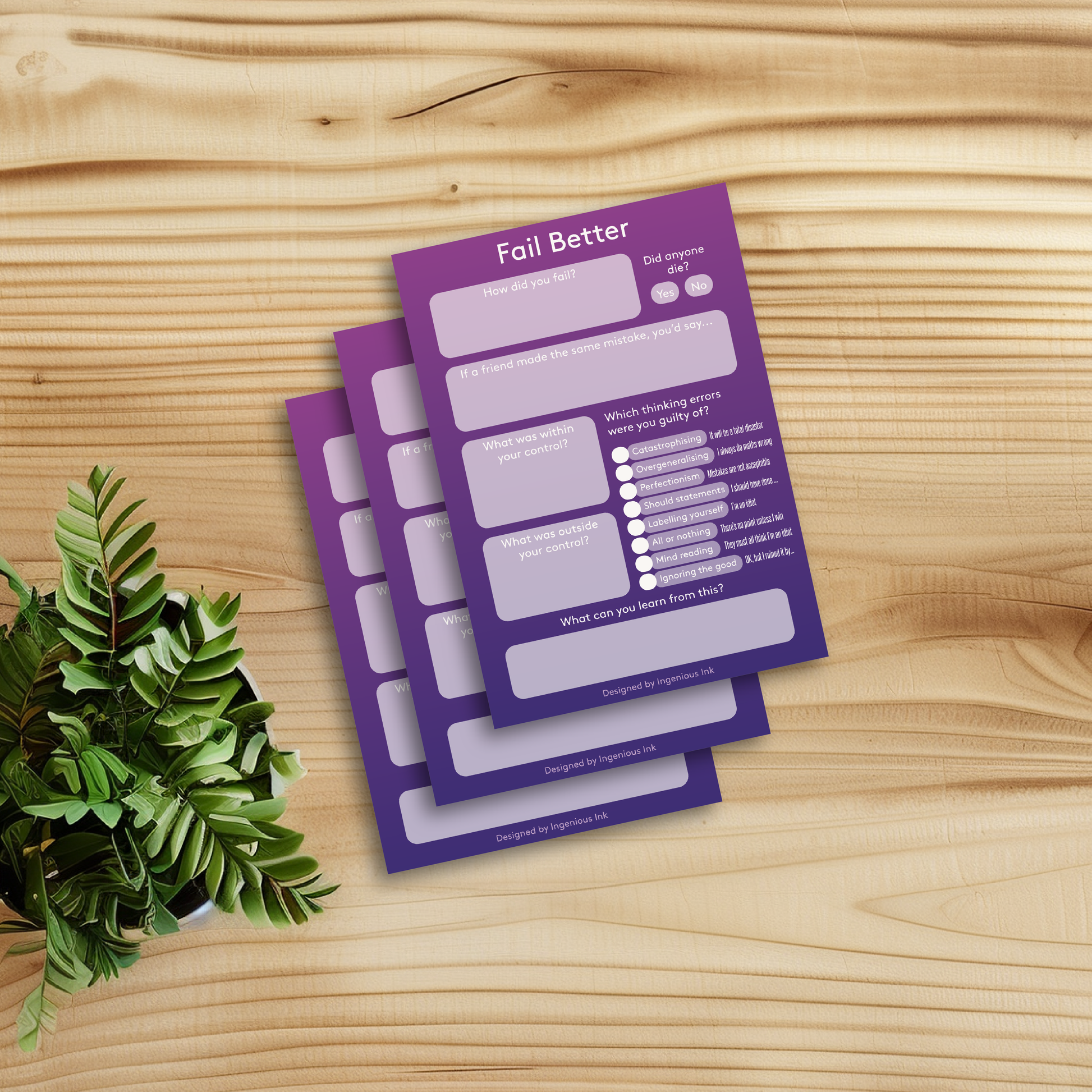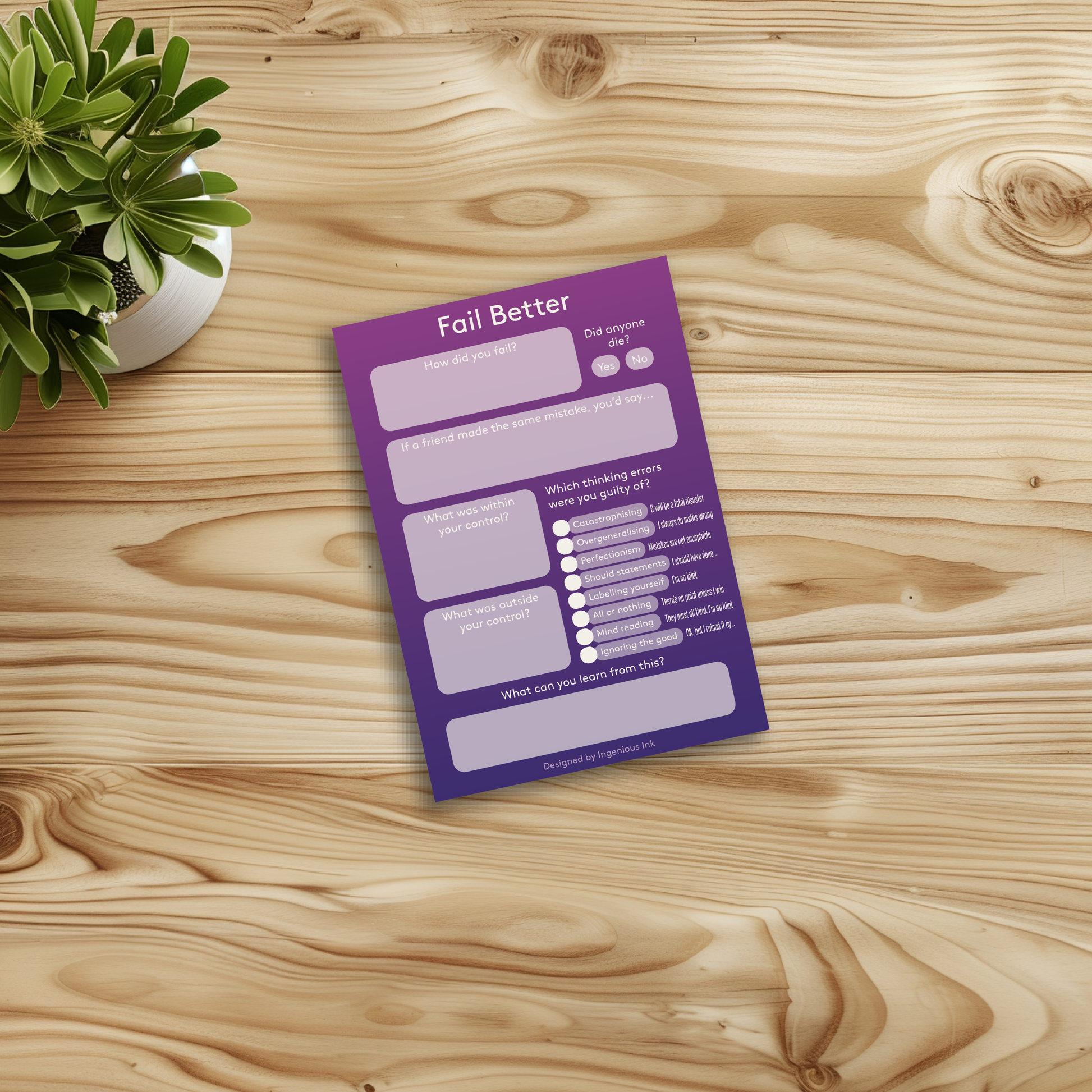 We designed this notepad to work through various issues sequentially. The first step was to get people to address that whatever their failure was, it probably wasn’t as bad as they were making it out to be. The second step is to identify the source of the emotional feelings that are stopping you from confronting the failure. Maybe you’re afraid that you’re just destined to fail this way forever, maybe you’re annoyed at yourself. Take a step back and try dispassionately reevaluating the situation. Finally focus on the things that you could control and work out how you could change these next time.