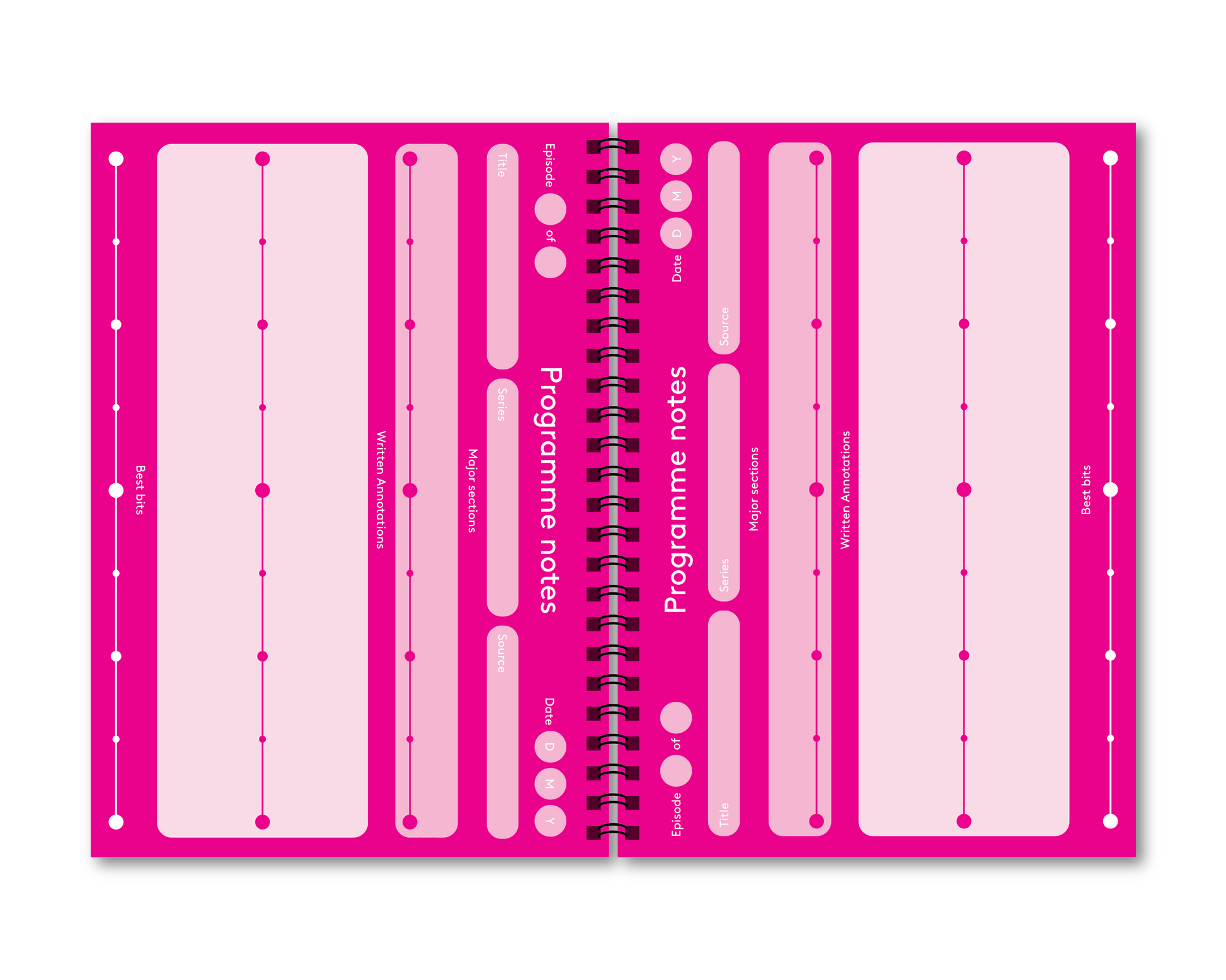 Notebook designed to help you make great notes on podcasts, lectures, documentaries, films, TV shows, and anything else that's recorded.