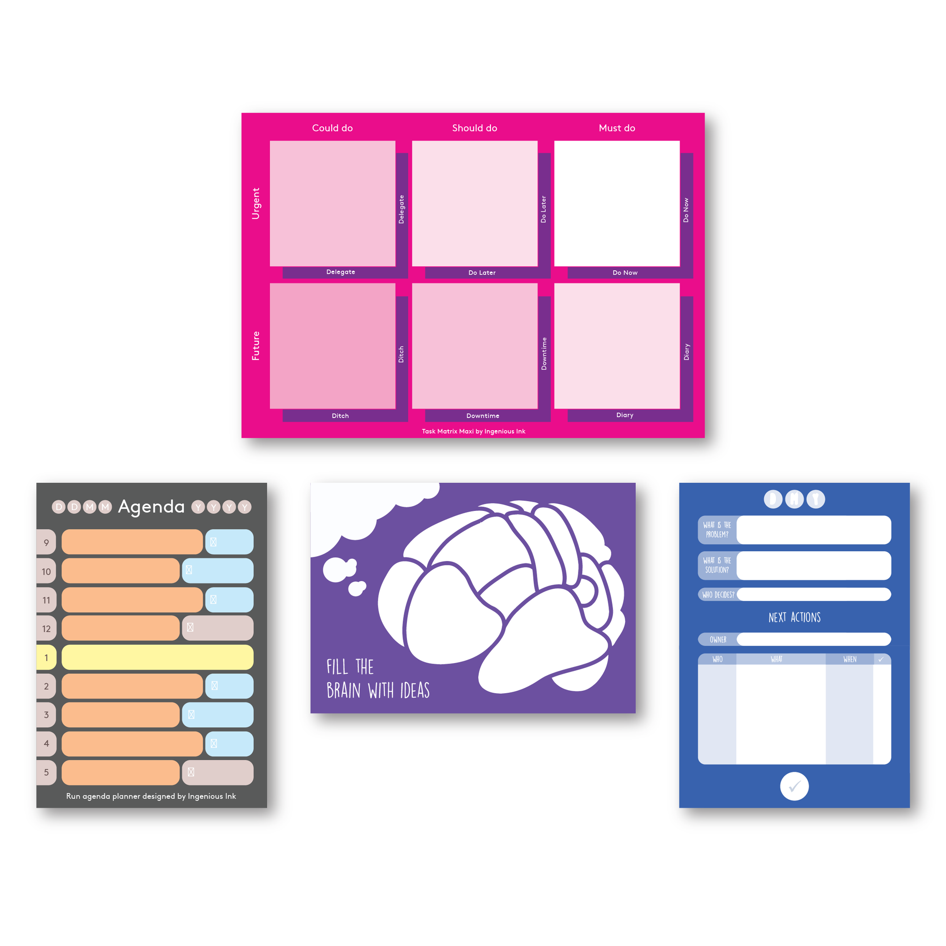 We have created a set of tools, colourful notepads to help you get back on track and be productive in your home office.